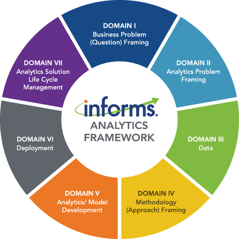 All three CAP certification exams share the same format and are based on the INFORMS Analytics Framework – seven domains covering business problem framing, analytics problem framing, data, methodology, model development, deployment, and analytics solution lifecycle management.