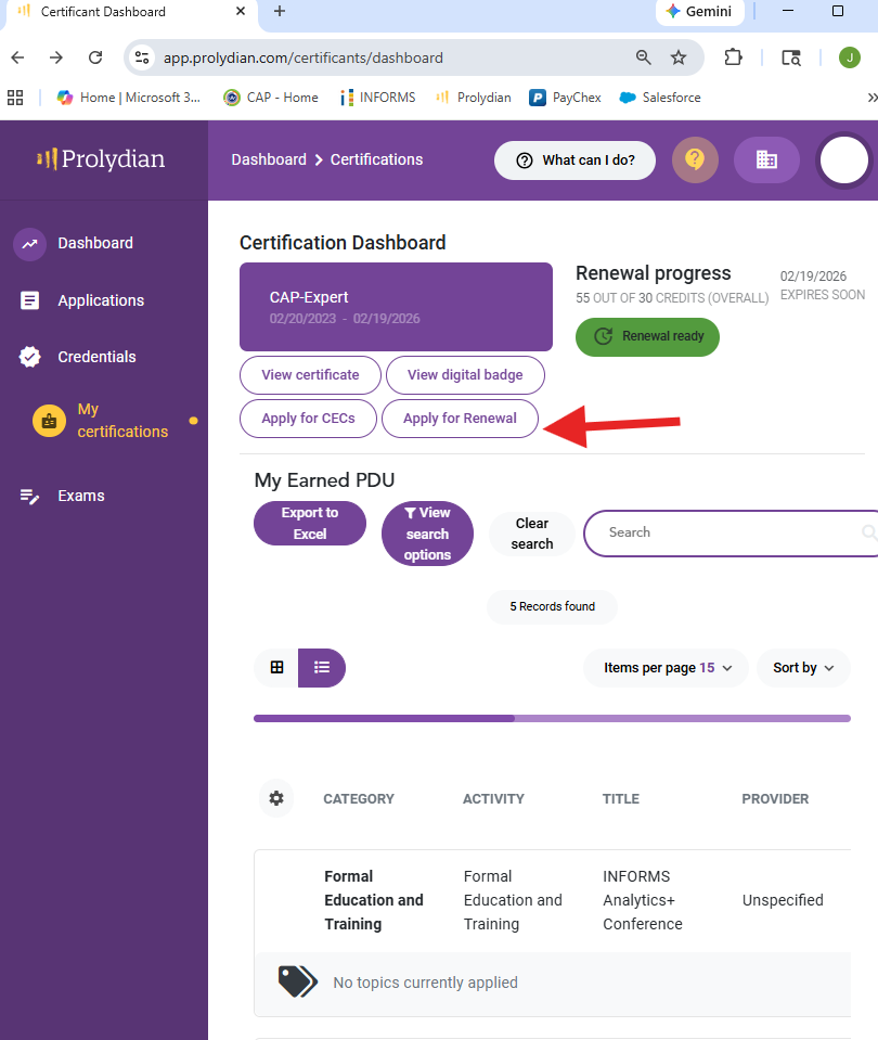 Step 5: To add more PDUs, you can return to your main dashboard, or you can click "Apply for CECs" from your My Certifications page.