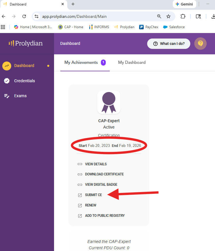 Step 3: Once logged in, navigate to your Dashboard. Click Submit CE under your CAP-Expert certification.