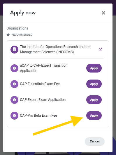 Step 3: Select the Exam you want to purchase, “CAP-Essentials Exam Fee” or "CAP-Pro Beta Exam Fee"
