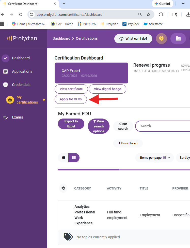 Step 5: To add more PDUs, you can return to your main dashboard, or you can click "Apply for CECs" from your My Certifications page.